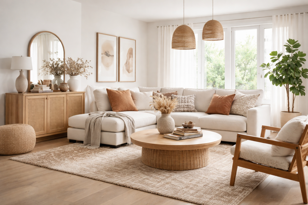 อบอุ่น โปร่งสบาย ใช้ไม้สีอ่อน สีขาว และผ้าเนื้อธรรมชาติ มักมีแสงธรรมชาติเป็นหัวใจสำคัญ